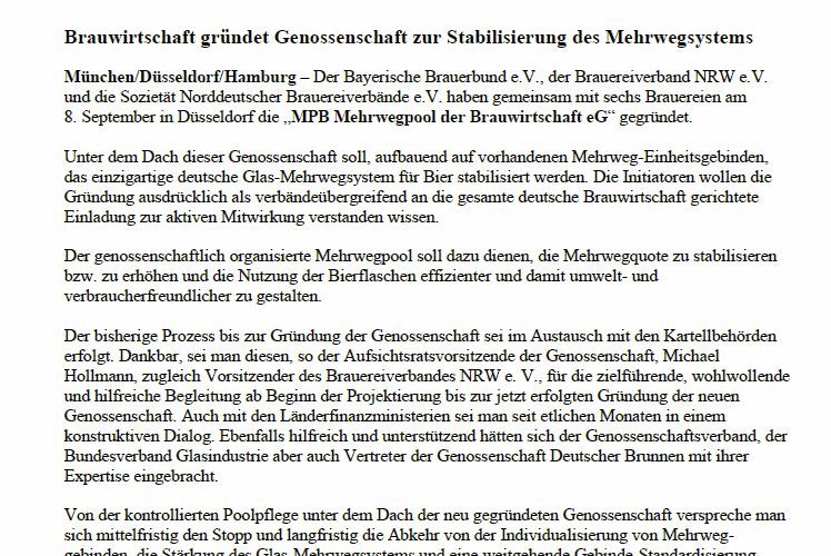 Brauwirtschaft gründet Genossenschaft zur Stabilisierung des Mehrwegsystems
