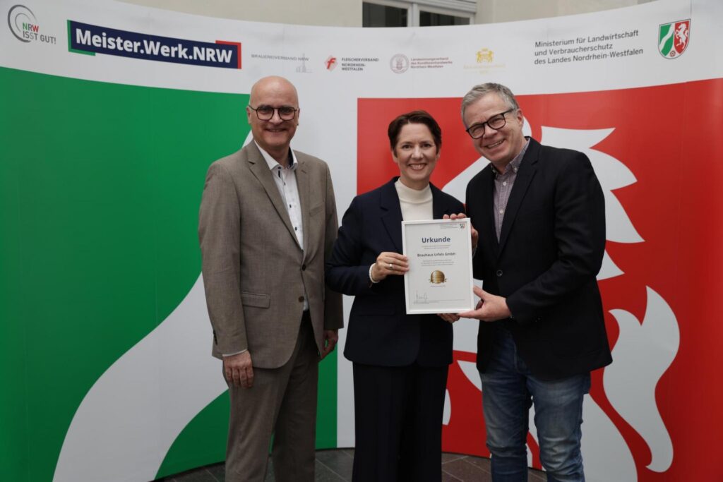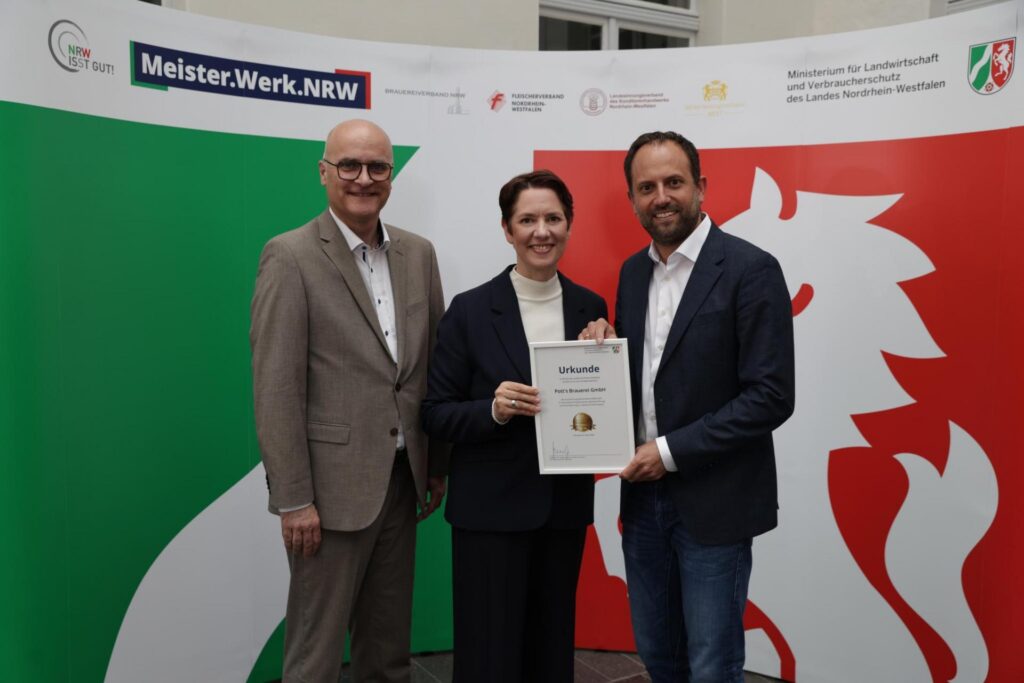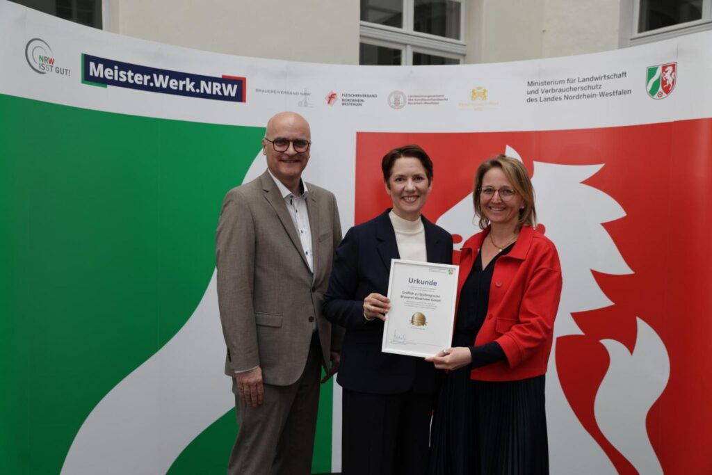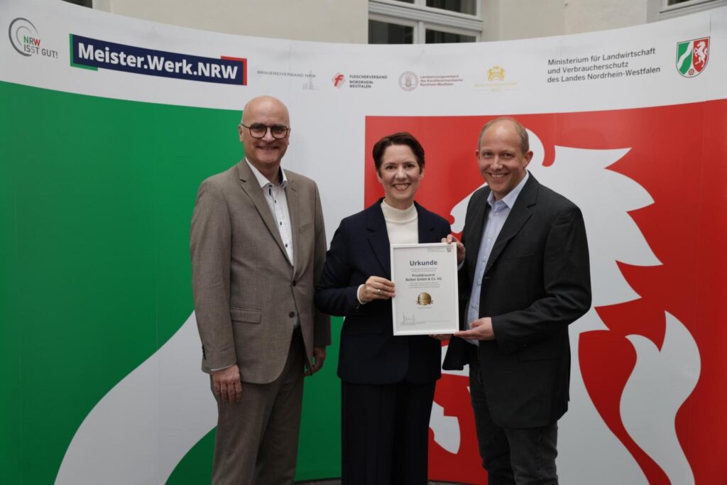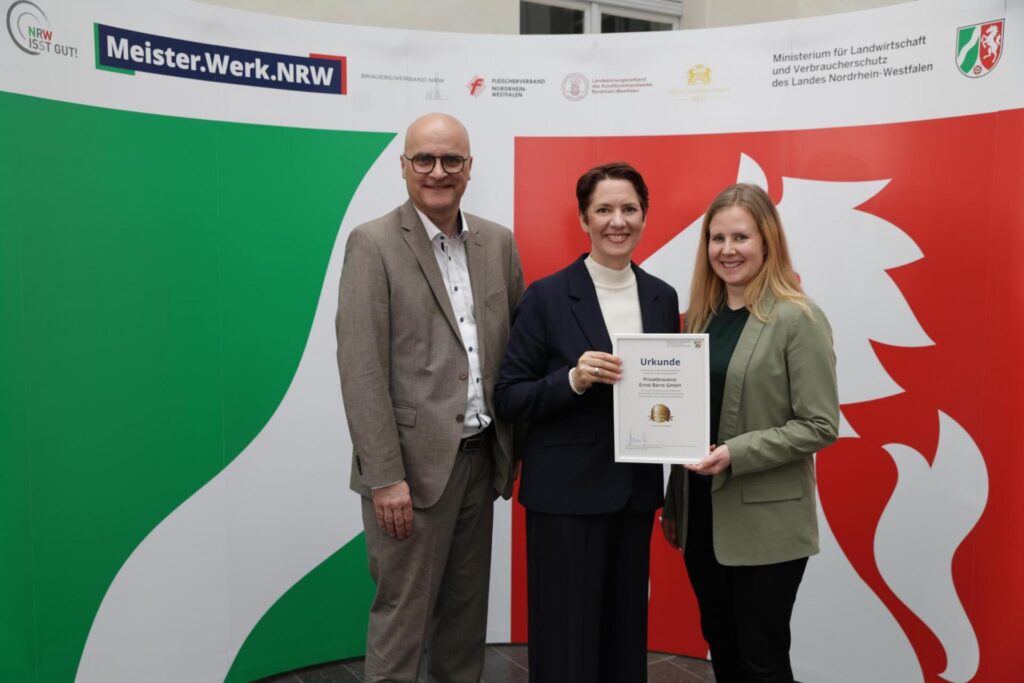 Auch in diesem Jahr dürfen sich wieder 7 Brauereien aus dem Brauereiverband NRW e.V. über die Auszeichnung mit dem Ehrenpreis „Meister.Werk.NRW“ für hervorragende Qualität in der Lebensmittelerzeugung freuen und erhielten im Maxhaus Düsseldorf ihre Urkunden von Landwirtschafts- und Verbraucherschutzministerin Silke Gorißen.