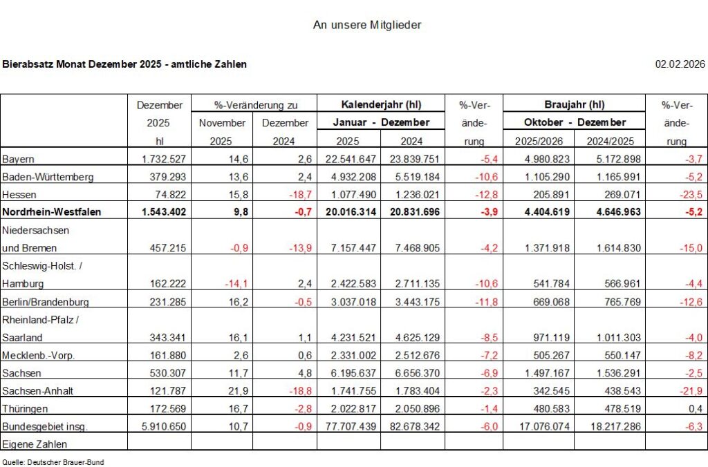 Bierabsatz für den Monat Dezember 2025
